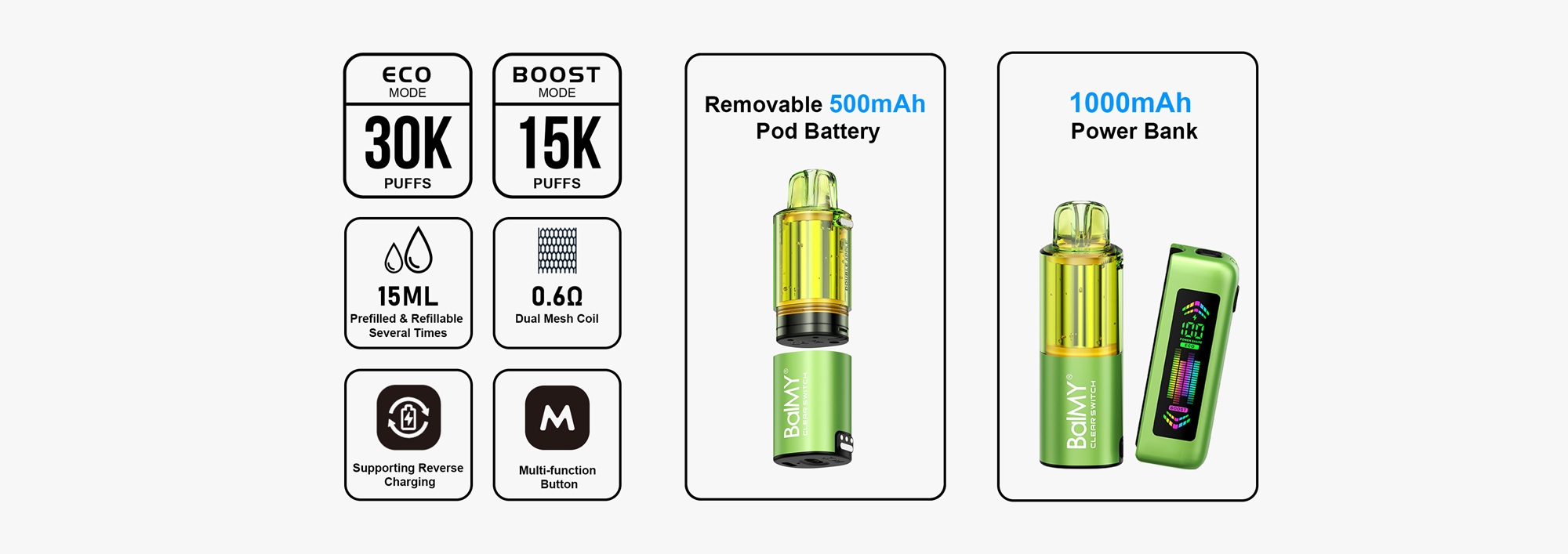 BalMY CLEAR SWITCH Pod Vape Kit is built for maximum endurance, customisation, and flavour diversity, offering one of the industry's big puff counts in a compact, advanced device. he device sports an display that tracks puffs, battery life, and settings, while magnetic pod connections and user-friendly side-fill design make refilling and changing flavours quick and mess-free. delivering reliable safety, versatility, and convenience for experienced and new vapers alikeThe BalMY CLEAR SWITCH is a next-generation modular disposable vape designed for high performance, cost savings, and sustainability. Unlike traditional disposables, the Clear Switch system separates the single-use prefilled pod from a reusable rechargeable power bank, reducing waste while offering extended usage.With a puff count of up to 30,000, each disposable pod holds up to 15ml of premium nic salts with a strength of 50mg.