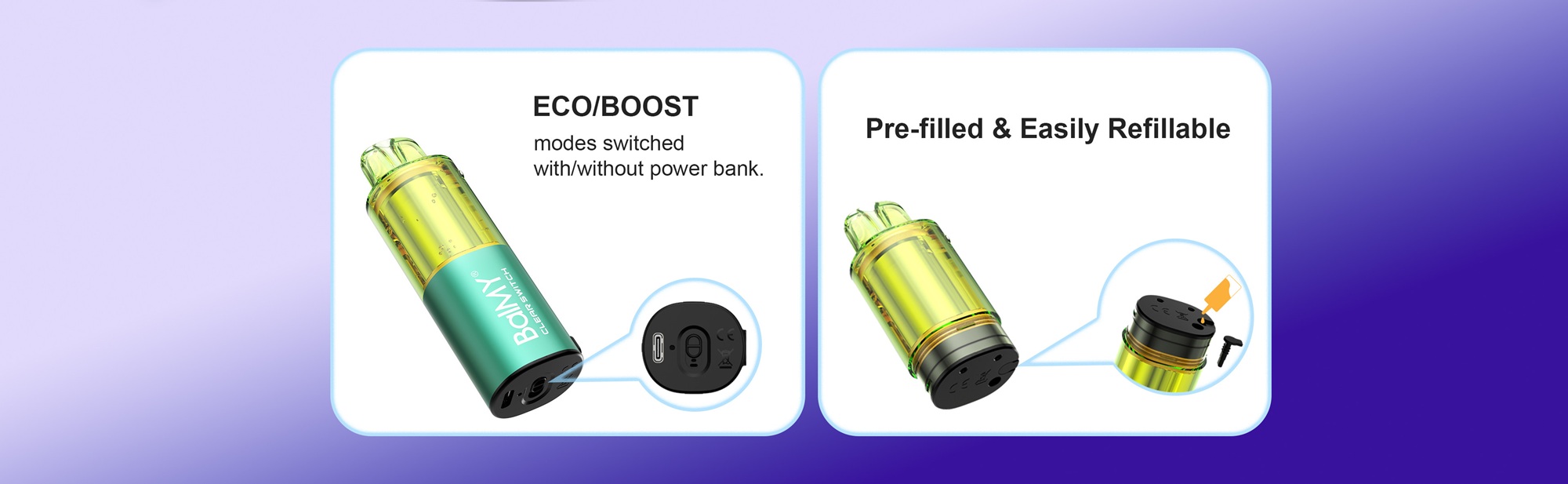 Unlike many rivals, the disposable pod can be recharged without the power bank, although it will not have full feature functionality. The power bank's battery of 1000mAh makes a very long-lasting disposable when the halves are combined. Cost Savings: By reusing the rechargeable power bank, customers only need to purchase BalMY Clear Switch Disposable Pods for refills-making it more affordable than traditional one-time disposables.