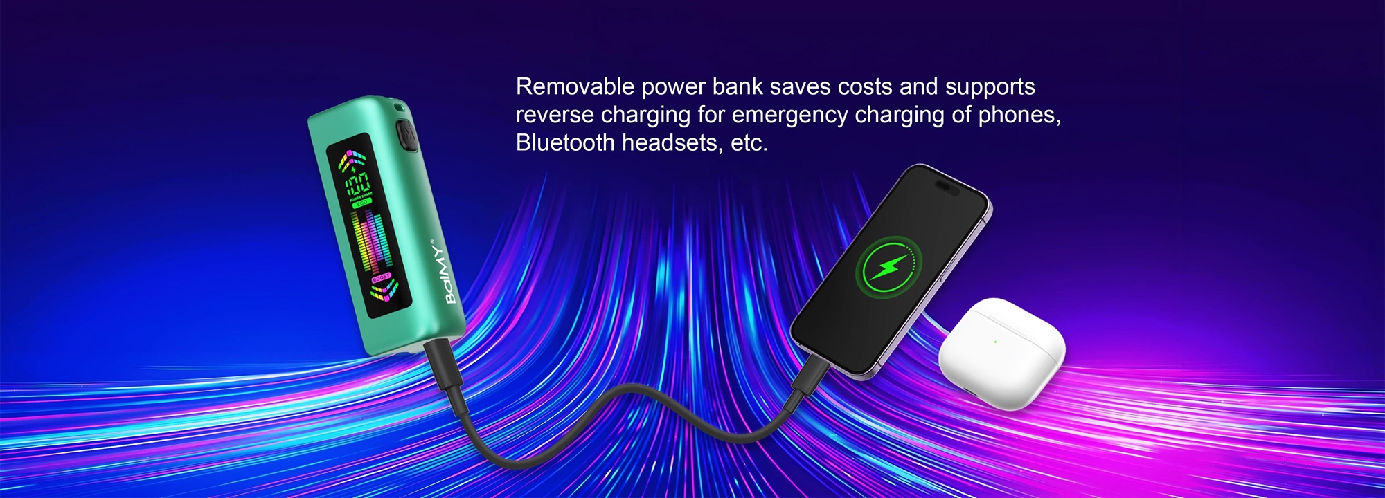 Both the pod battery and power bank support Type-C charging, and the power bank can charge the Pod battery via magnetic charging. |