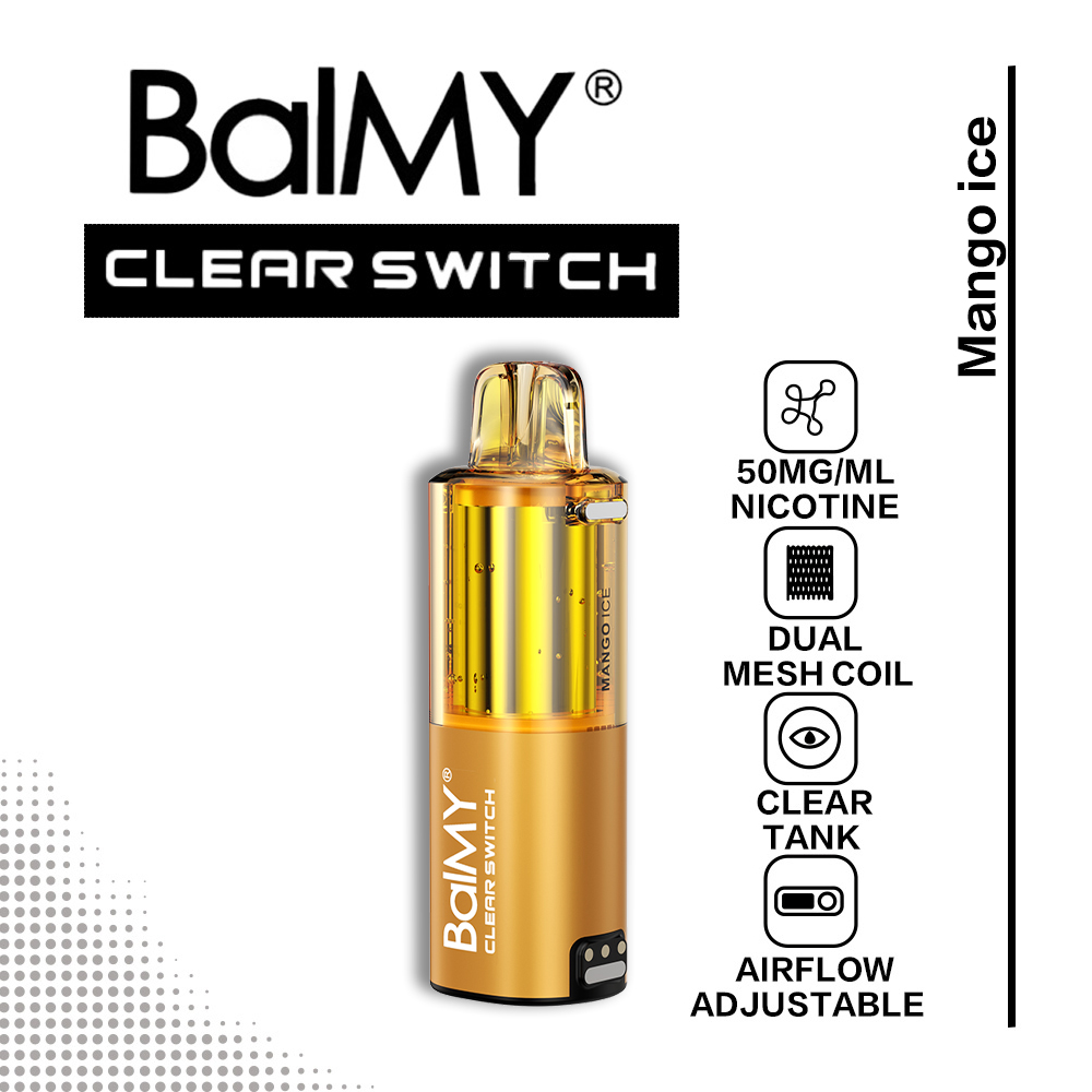 The BalMY CLEAR SWITCH is a next-generation modular disposable vape designed for high performance, cost savings, and sustainability. Unlike traditional disposables, the Clear Switch system separates the single-use prefilled pod from a reusable rechargeable power bank, reducing waste while offering extended usage.With a puff count of up to 30,000, each disposable pod holds up to 15ml of premium nic salts with a strength of 50mg.Product Highlights